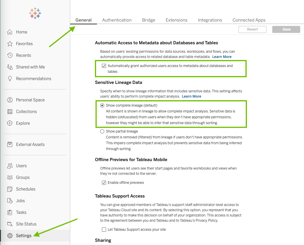 If you use the Explorer role, you have to ensure that the lineage harvester can access all of the lineage information. Specifically, as a Tableau administrator, click Settings > General, and ensure that the following options are selected: