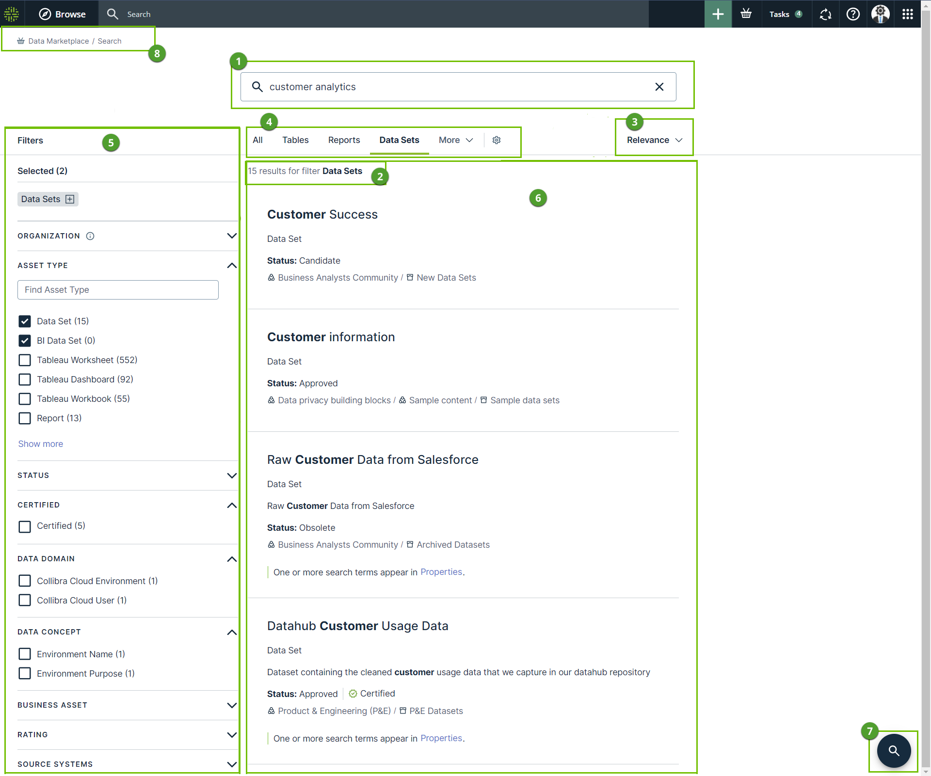 Breadcrumb in Data Marketplace | The breadcrumb provides information on your location in Data Marketplace. Click the Data Marketplace link to go back to landing page. |