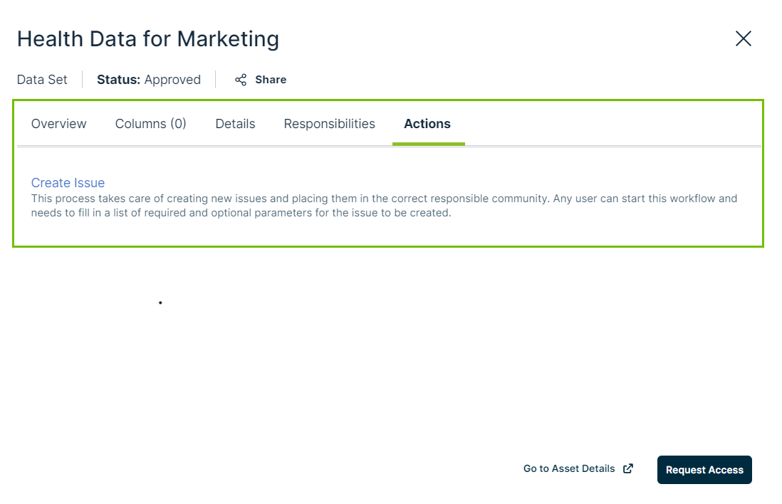 In this example, the Create Issue workflow is available in the Actions tab page of an asset preview.