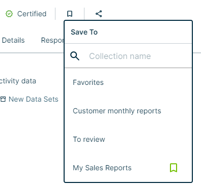 The Save To list appears.TipA colored bookmark icon in the Save To list indicates that the asset has been added to that collection already. You can remove the asset from a collection by clicking the colored bookmark icon.