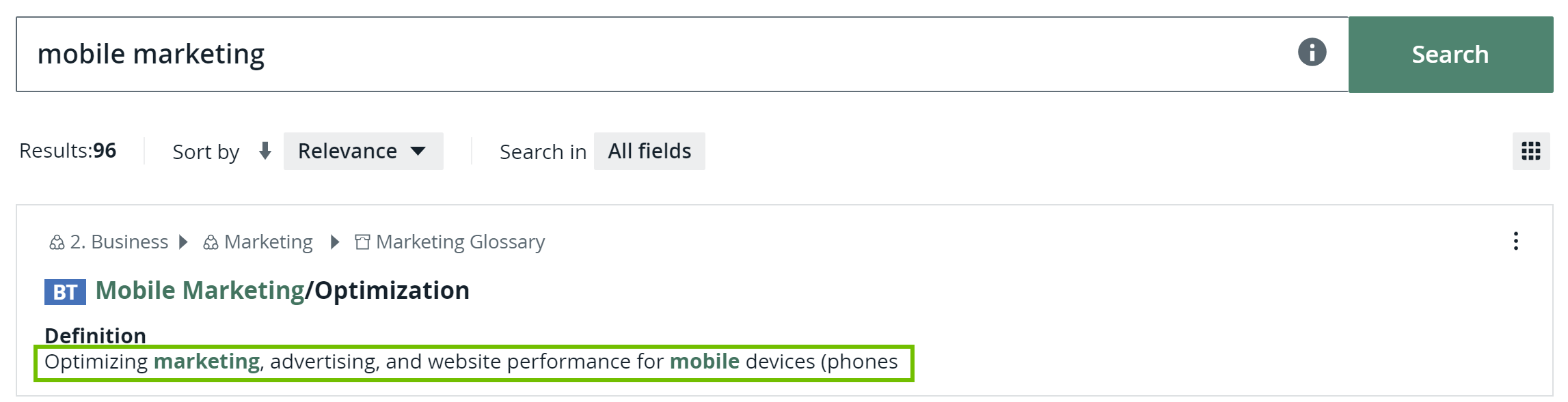 Note If the text in a field is long, the text is shortened when shown in the search results. For example, in the following image, the highlighted definition in the search result shows only a part of the full definition.
