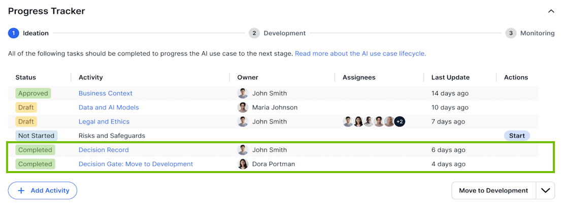 Decision records are not carried forward when the AI use case status evolves. You can always use the stage stepper tabs in the Progress Tracker to go back and revisit the decision records you and others created in an earlier lifecycle stage.