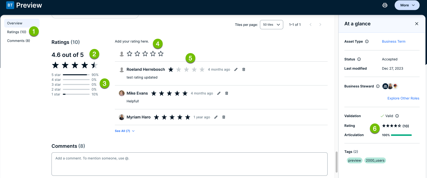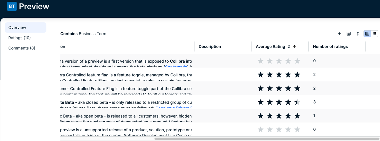 If ratings are enabled for an asset type and one or more ratings has been provided for an asset of that type, the associated ratings activity appears in several places in the UI.