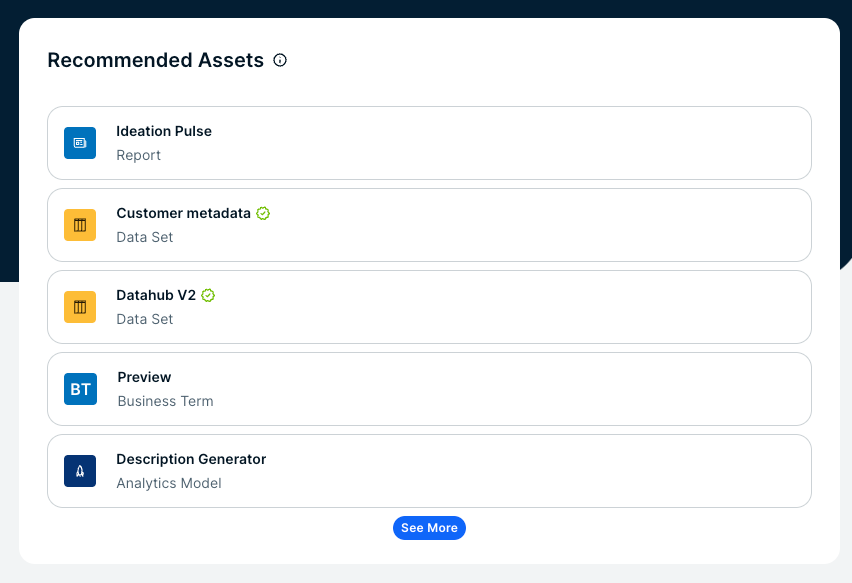 - It is possible that no relevant assets can be suggested because of applied asset type, community, or domain filters where the recommendations are shown. For example, assets outside the Data Marketplace scope will not be recommended in the context of Data Marketplace.