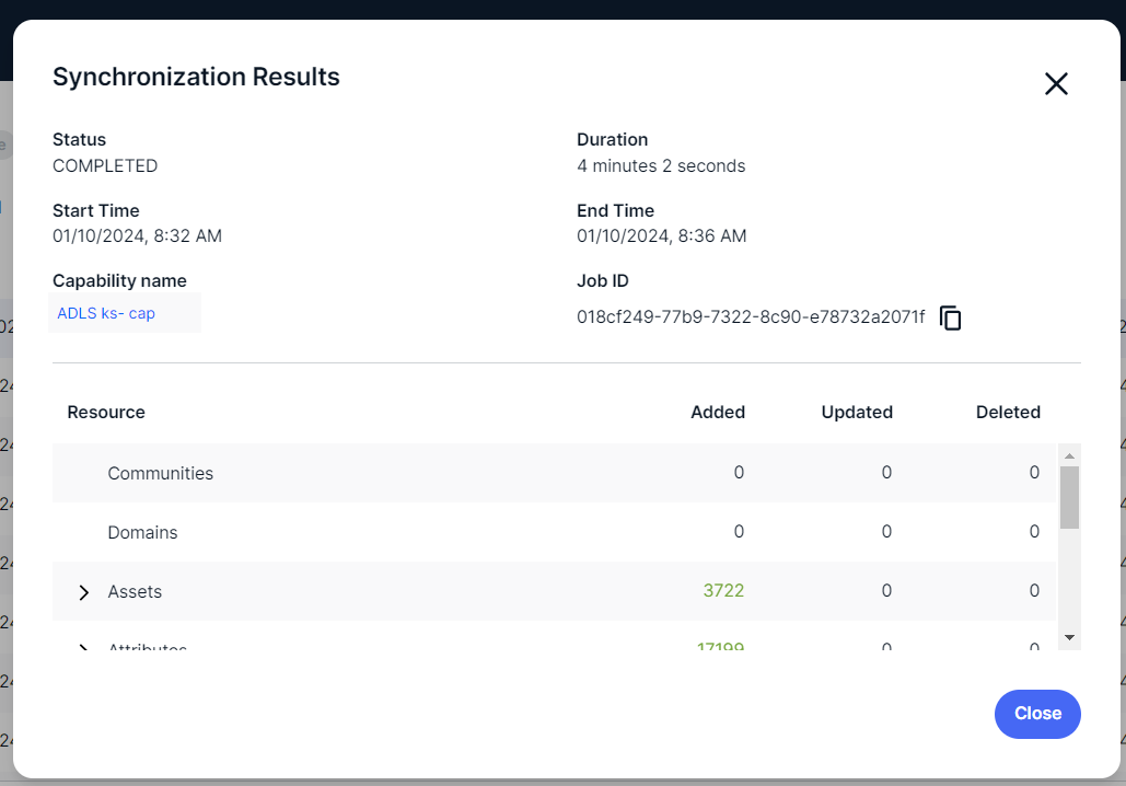After you synchronized an ADLS file system, you can view the summary of the results. This shows the impact of the synchronization on the assets in Collibra Data Intelligence Platform.