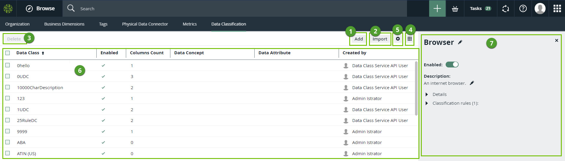 A table that shows all the data classes that exist in your environment. Click anywhere in the row of a data class to view the details of the data class in an extra pane (7) and update them. Click the Preview button that appears when you hover over a data class to view the details of the data class in an extra pane (8) and update them. Note You can't see the Data Categories, Data Attributes, or Data Concepts for which you don't have the View permission. |