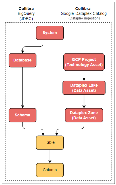 | Integrating Google Dataplex Catalog - Dataplex ingestion | Google Dataplex Catalog is a technical catalog on Google side provides information for all the data in the various Dataplex projects. If you use the Google Dataplex ingestion, we will register and synchronize the GCP Projects, Dataplex Lakes, Dataplex Zones, Tables, and Columns. The integration will create the whole asset structure, representing Dataplex objects such as Project, Lake , Zone, Table, Column, and allows for filtering based on Lakes and Zones. |