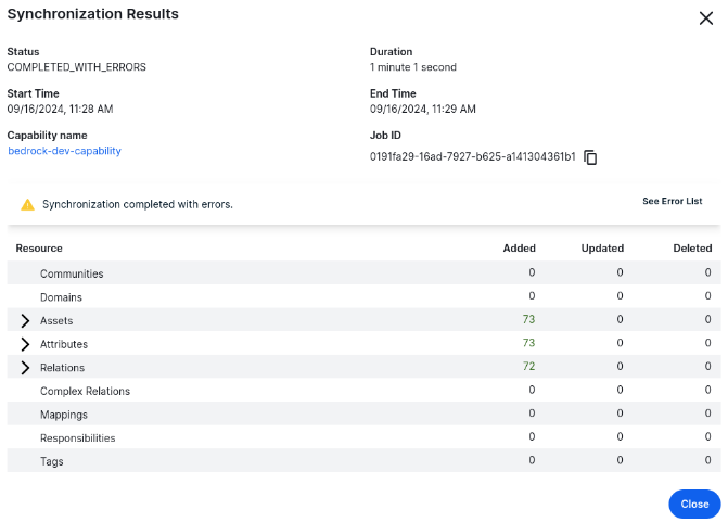 After you synchronized AWS Bedrock AI, you can view the summary of the results. This shows the impact of the synchronization on the assets in Collibra Data Intelligence Platform.