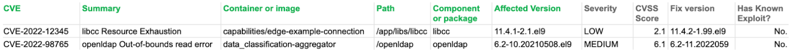- Multiple occurrences of the same CVE against different images/containers or components must be listed on separate rows. Reports where a single package/component is listed in one column and multiple CVEs for that package/component are in another column will be rejected.