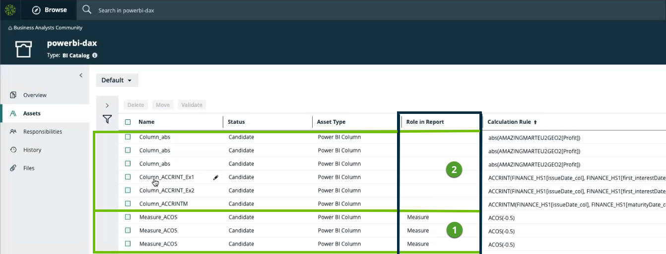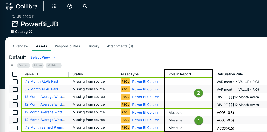 On Power BI Column asset pages, there are two attribute types that are relevant for this feature: the Role in Report and Calculation Rule attributes.