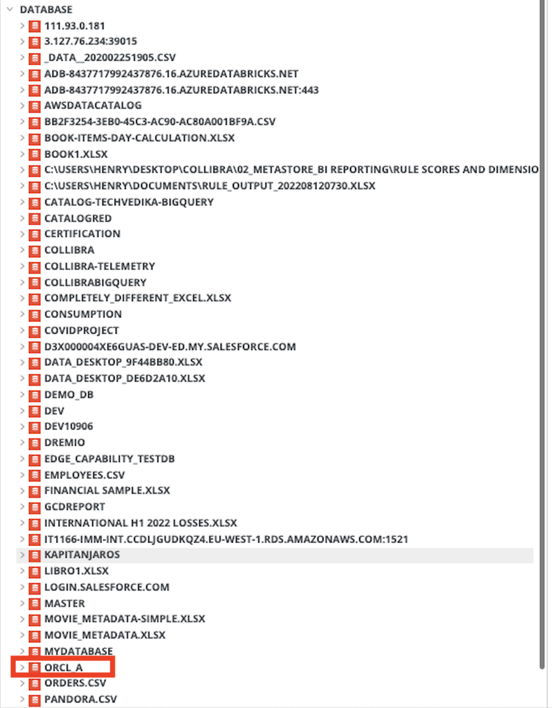 If we run a full-sync of the Tableau source without a <source ID> configuration file, the databases are shown as follows: