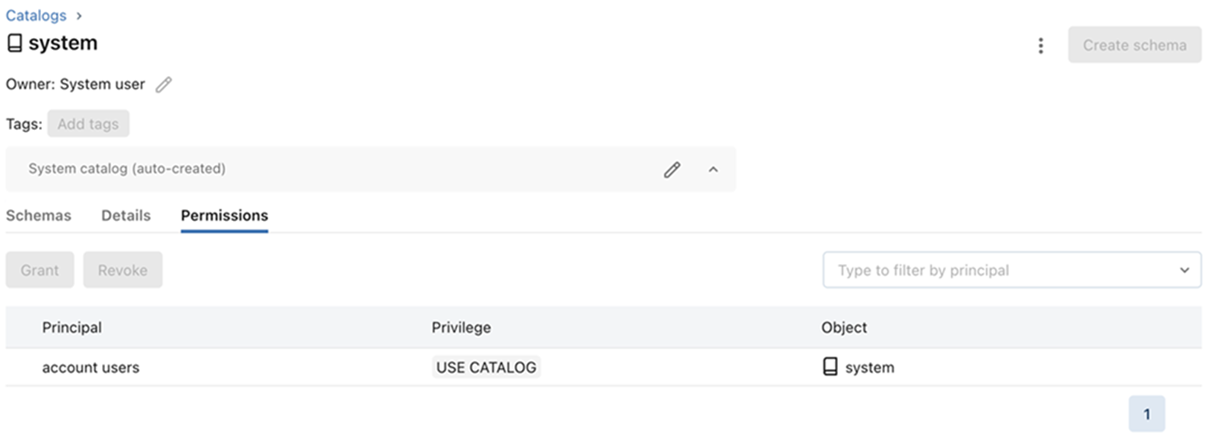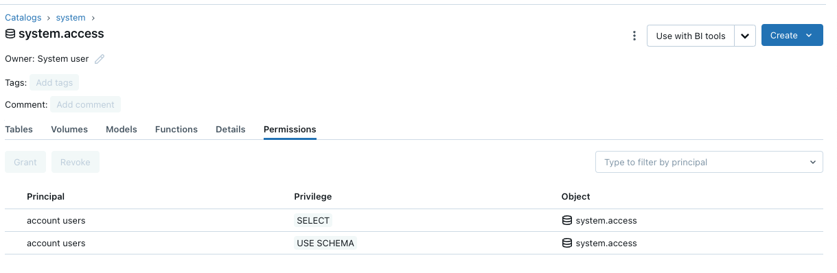 • USE_SCHEMA, and SELECT privileges to the system.access schema.