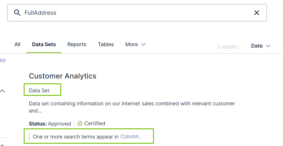 If relation-based search is enabled and you search for "FullAddress', then the "Customer Analytics" data set appears in the search results because the column name matches the search term and there is a Data set - Column relation between "FullAddress' and "Customer Analytics".