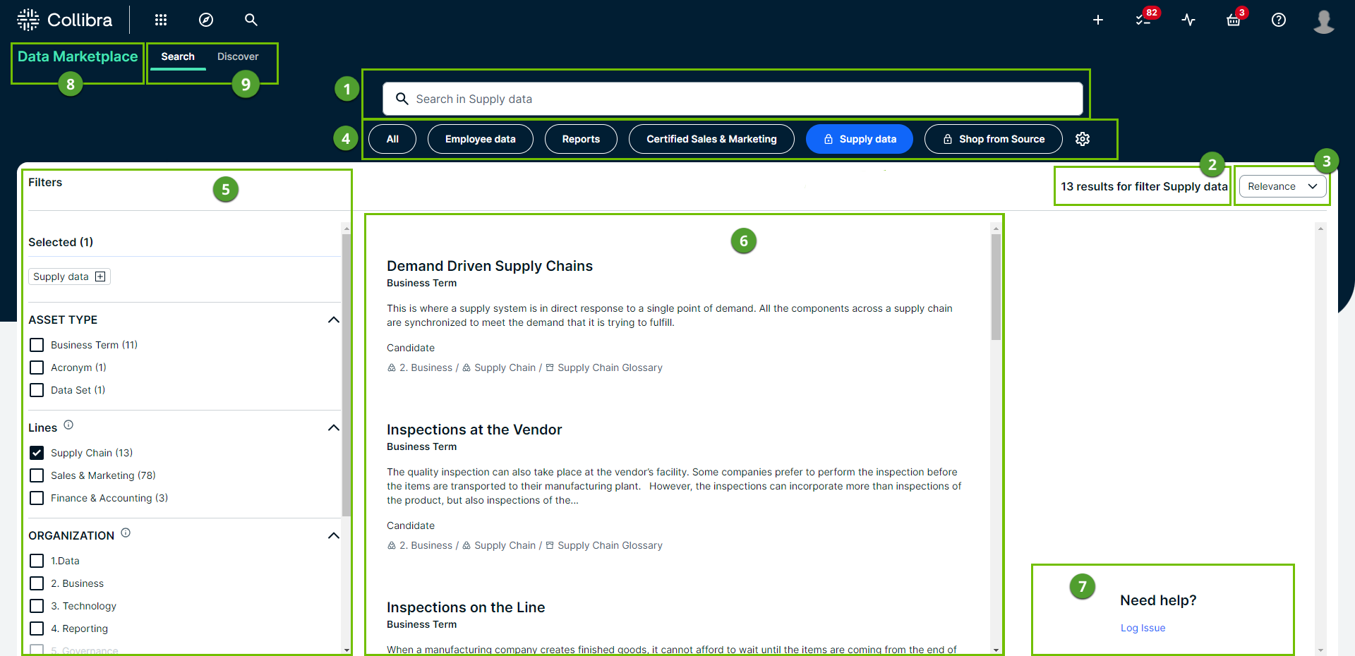 Breadcrumb in Data Marketplace | The breadcrumb provides information on your location in Data Marketplace. Click the Data Marketplace link to go back to the landing page. |
