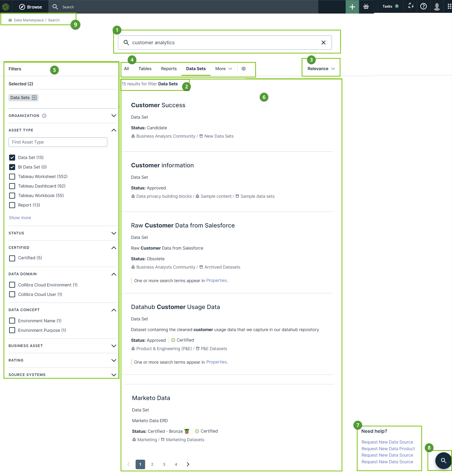 The standalone Data Marketplace search results page consists of the following sections and features.