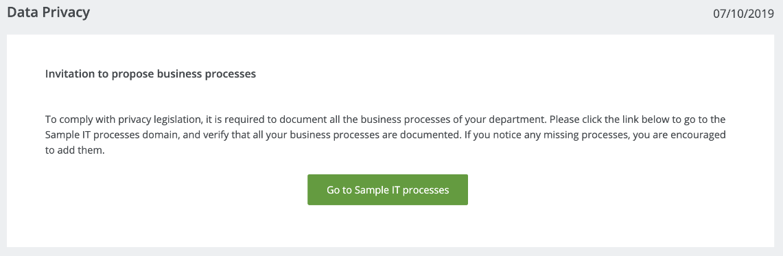 As the Business Steward, Privacy Steward, or Data Protection Officer for a Process Register domain, you can invite business users to participate in the development of the domain by reviewing any existing Business Process assets in the domain and proposing any business processes that do not yet exist as assets.