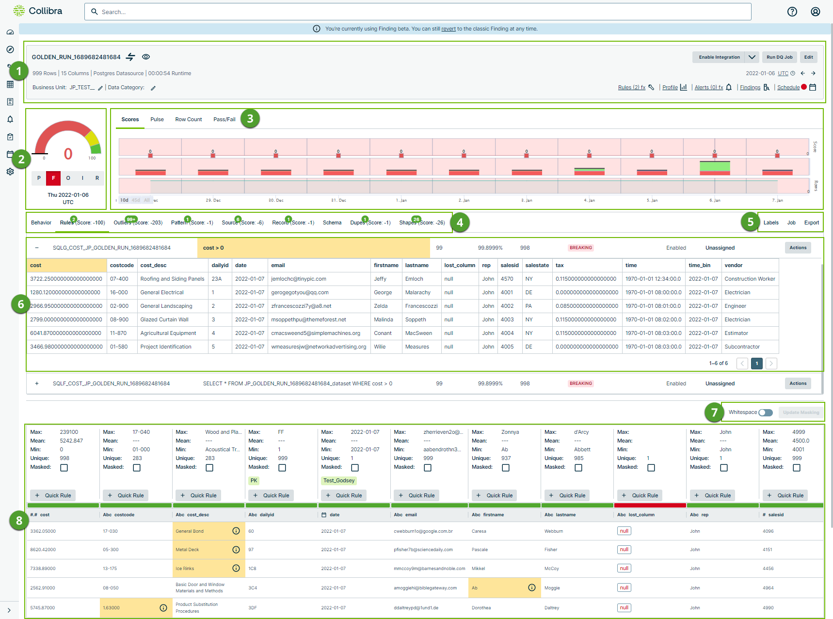 Metadata bar | A dataset anchor that empowers you with the ability to access crucial data quality components related to your dataset, such as its Findings, Profile, and associated rules and alerts. | ||||||||||||||