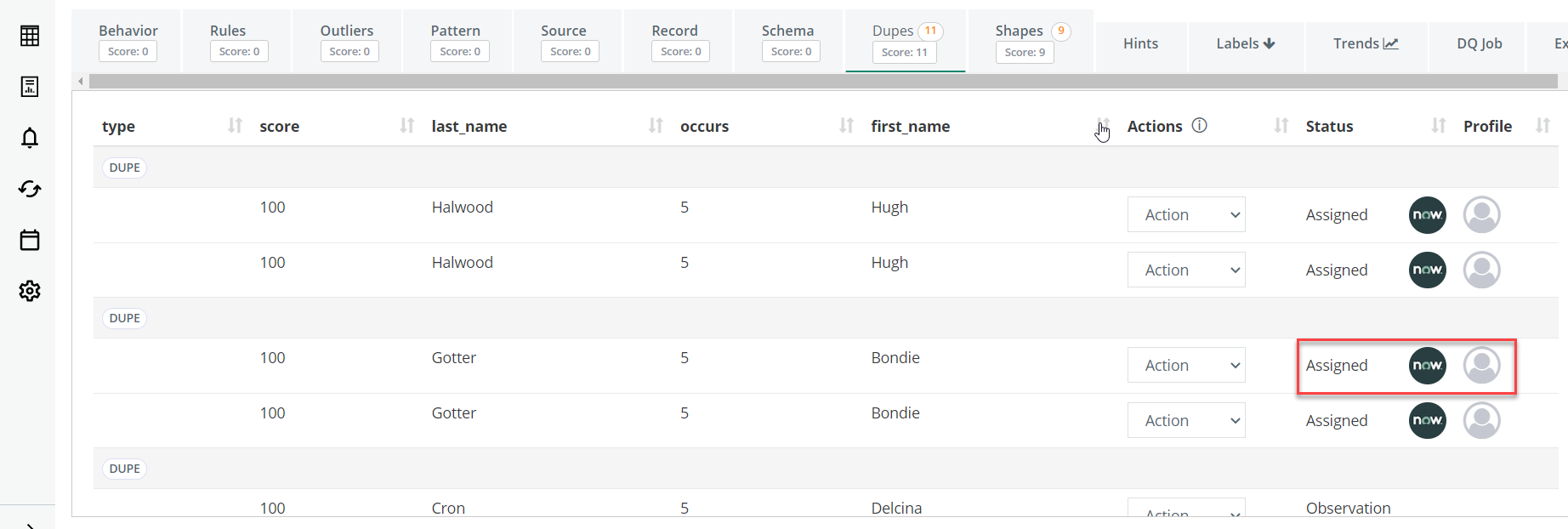 You can distinguish whether the user is a CDQ or ServiceNow assignment in the Profile column. Users are represented by an icon, rather than their names or usernames.