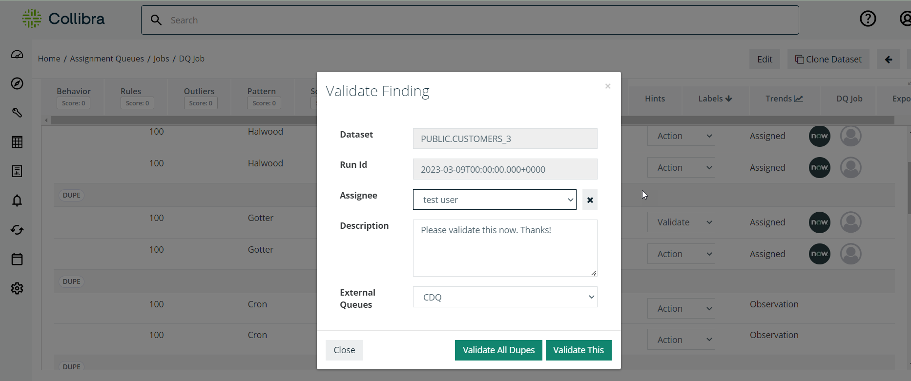 Field Description Dataset Dataset of the finding. This field is already populated. Run Id ID of the DQ job run. This field is already populated. Assignee Collibra DQ user. Select the user from this dropdown. Description Enter a message for the user, such as "Please validate now". External Queues Select the internal/external user from this dropdown.