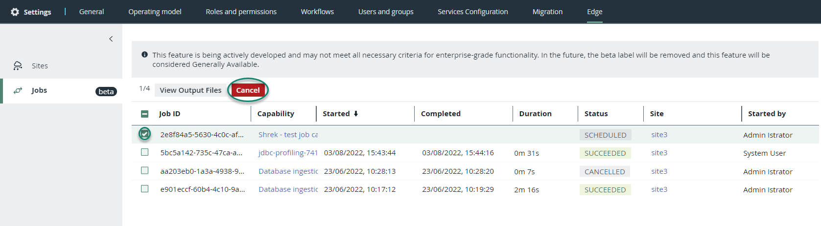 You can cancel an Edge site job which is either running or queued to run.