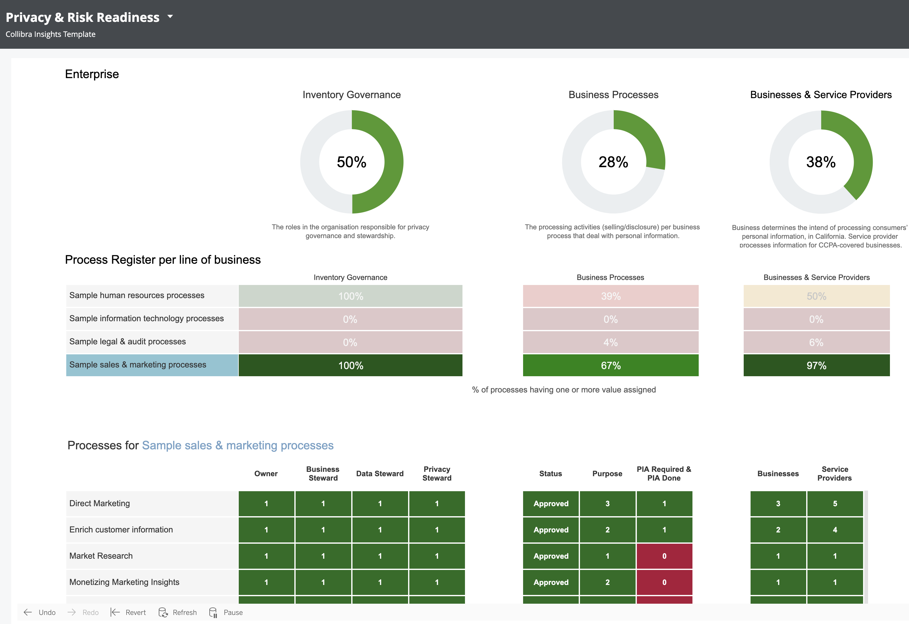 The Privacy & Risk Readiness report helps you to track the development of your organization's data and progress towards compliance with the relevant regulation.