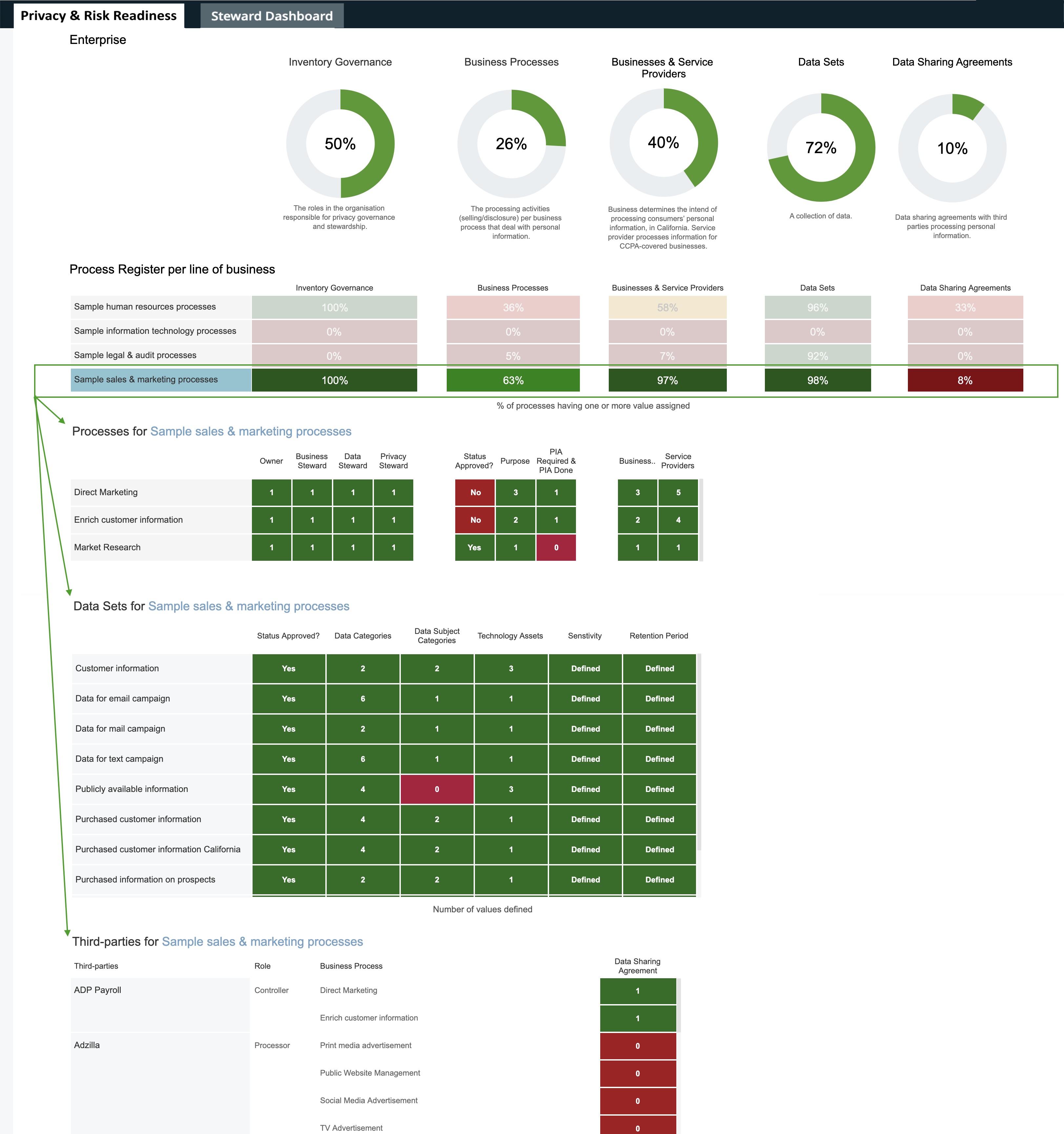 Drilling down further, you can monitor the process registers of specific lines of business, including the business processes, data sets, and third-parties related to a specific process register.