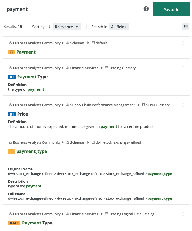 The resources that match the exact search text in the Name attribute of the resource are shown first. In this example, there is only one exact match—the Schema asset with the name Payment.