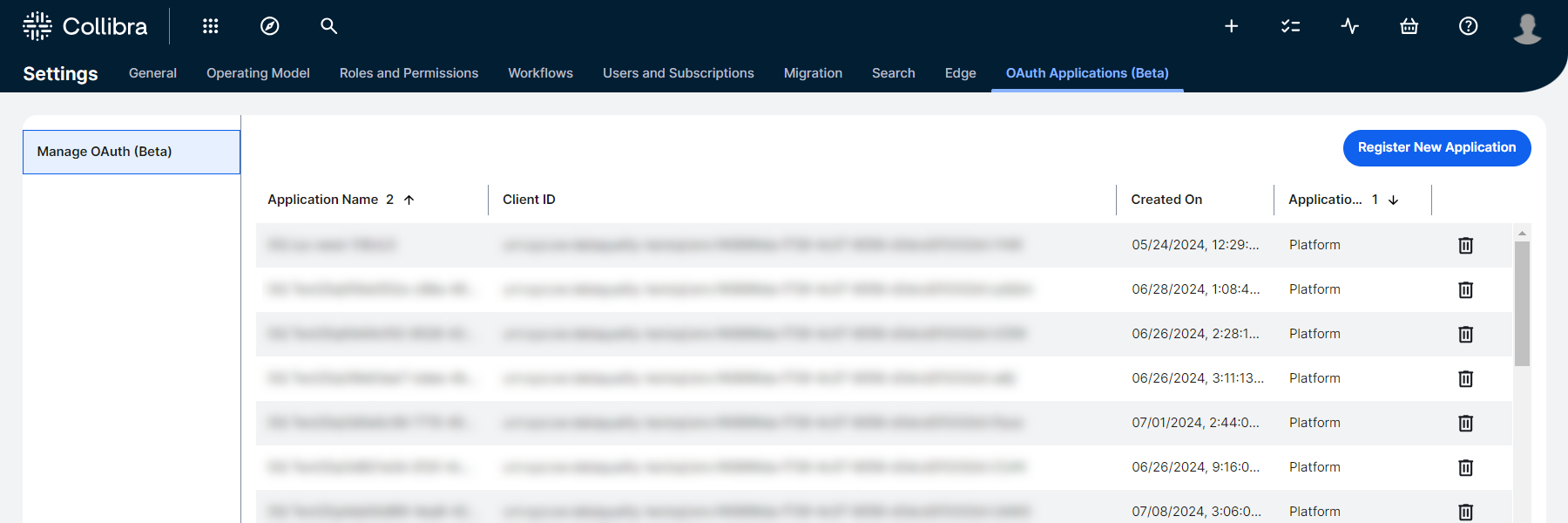 You can securely authenticate and authorize your applications to access Collibra public APIs without requiring individual user credentials. The Manage OAuth page allows you to register your applications to obtain a client ID and client secret that are required to request an access token:
