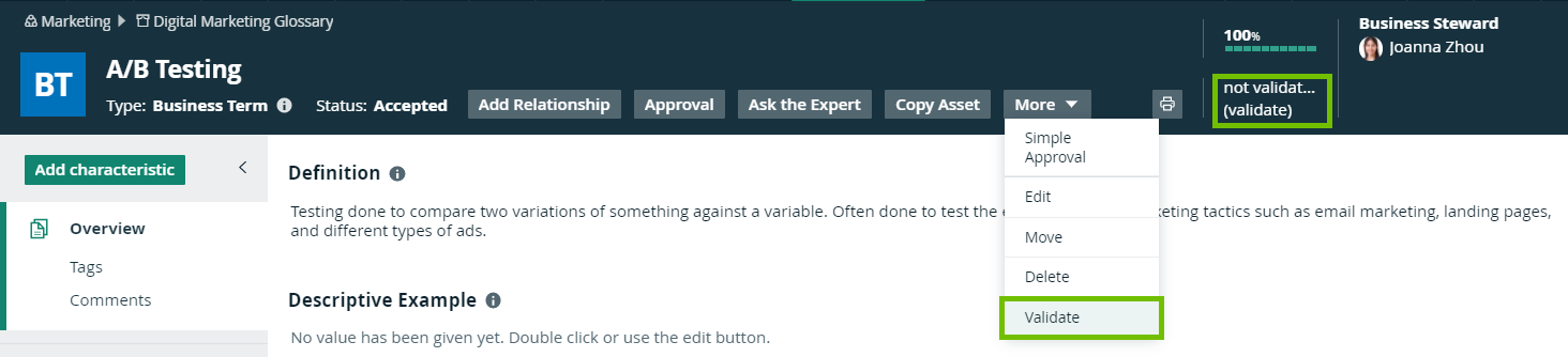 Validating an asset executes all validation rules assigned to the asset type. If an asset does not meet all validation rules, the asset is invalid.