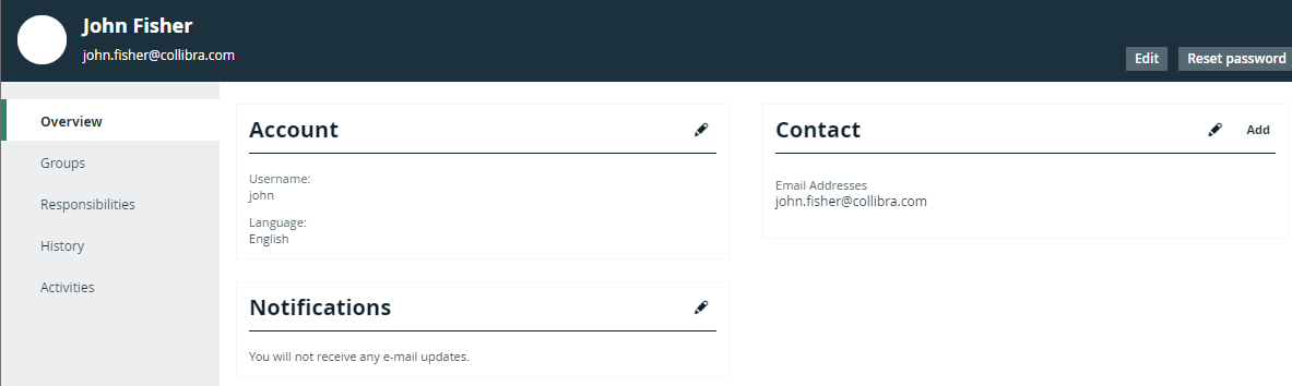 | Overview | The overview page contains general information such as the user's account information, mail notification settings and contact information. | |||||||||||||||||||||||||||||||||||||||