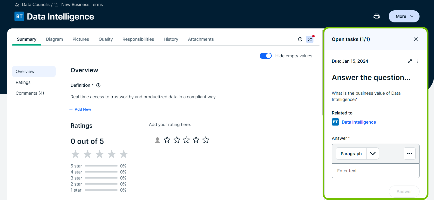 By default, the sidebar displays At a glance information about the asset. Unless you are accessing the asset page from the Tasks page or an email notification, select the Tasks icon to display the task in the sidebar. You can complete all task actions from the sidebar.