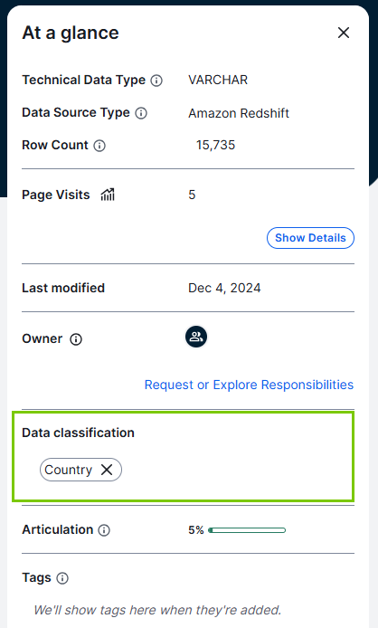 On a Column asset page, the data classification for a column is shown in the At a glance sidebar. If the At a glance sidebar is hidden, click