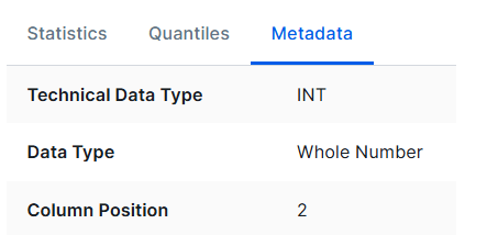 Note If the pattern is different, the type will be set to Text and no formatting will be applied. Edge doesn't take Advanced data types into account. By default, Collibra anonymizes profiling results in Column assets that have data with the Text or Geo data type. However, it is possible to anonymize the profiling results for all columns. For more information, go to Anonymization via Edge. Note The Data Type is available in the Metadata tab of the descriptive statistics. If the profiling process has detected a wrong data type, you can update the data type there. If you enable the Anonymize data option in Collibra Console, Collibra anonymizes data in Column assets that have data type Text and Geo. If the profiling process has detected a wrong data type, you can update it afterwards. |