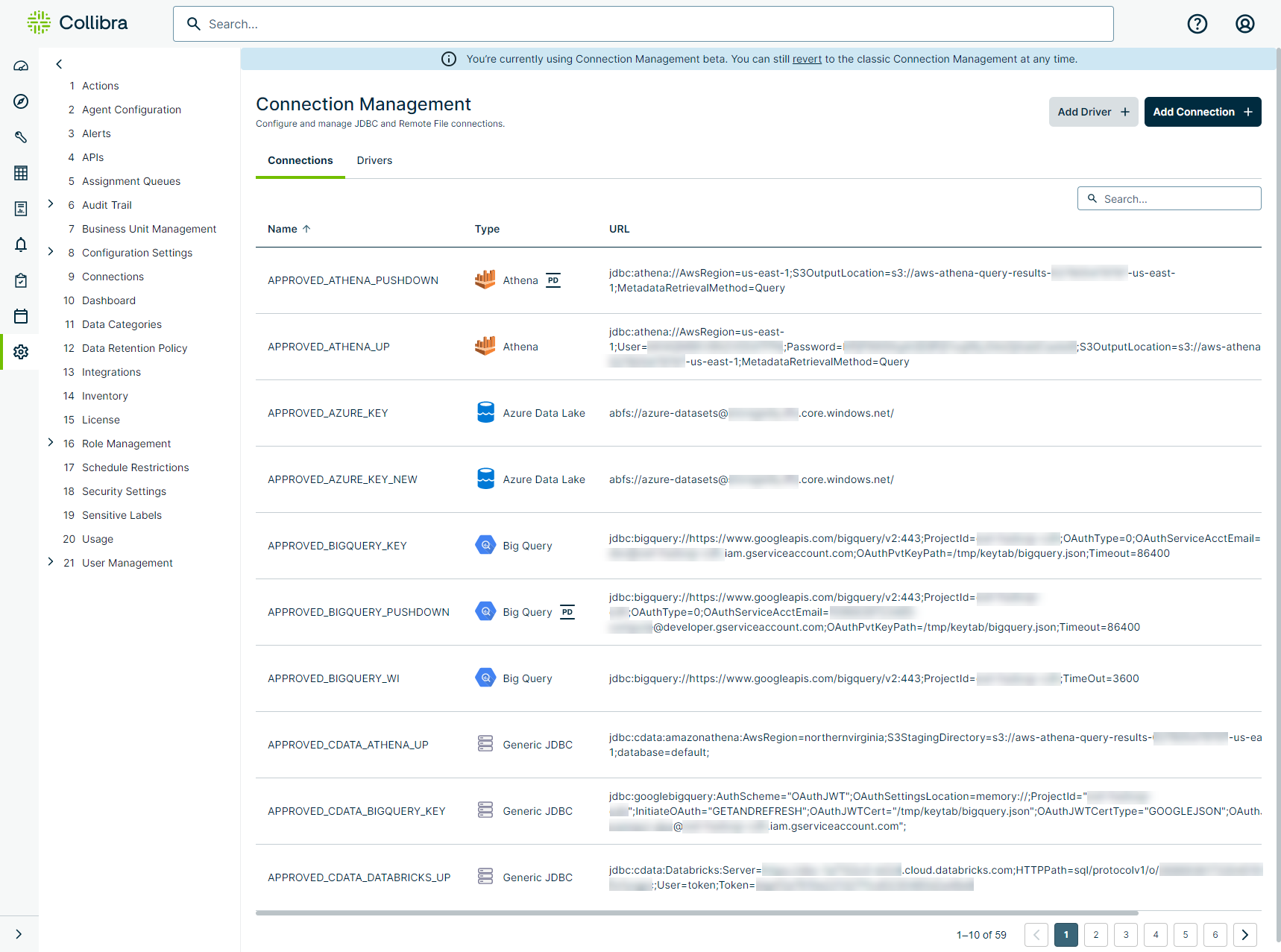 Connection Management lets administrators add, edit, and delete drivers and connections to data sources outside of Collibra DQ. In order for Collibra DQto run data quality checks, you need to first connect to source data. Collibra DQ is able to establish connections to many common data sources, including: