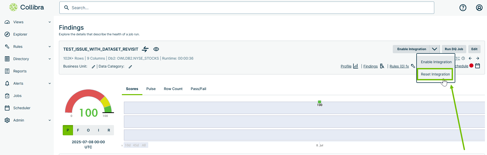 - In the metadata ribbon at the top of the page, click the drop-down next to the Enable/Disable Integration button and select Reset Integration.