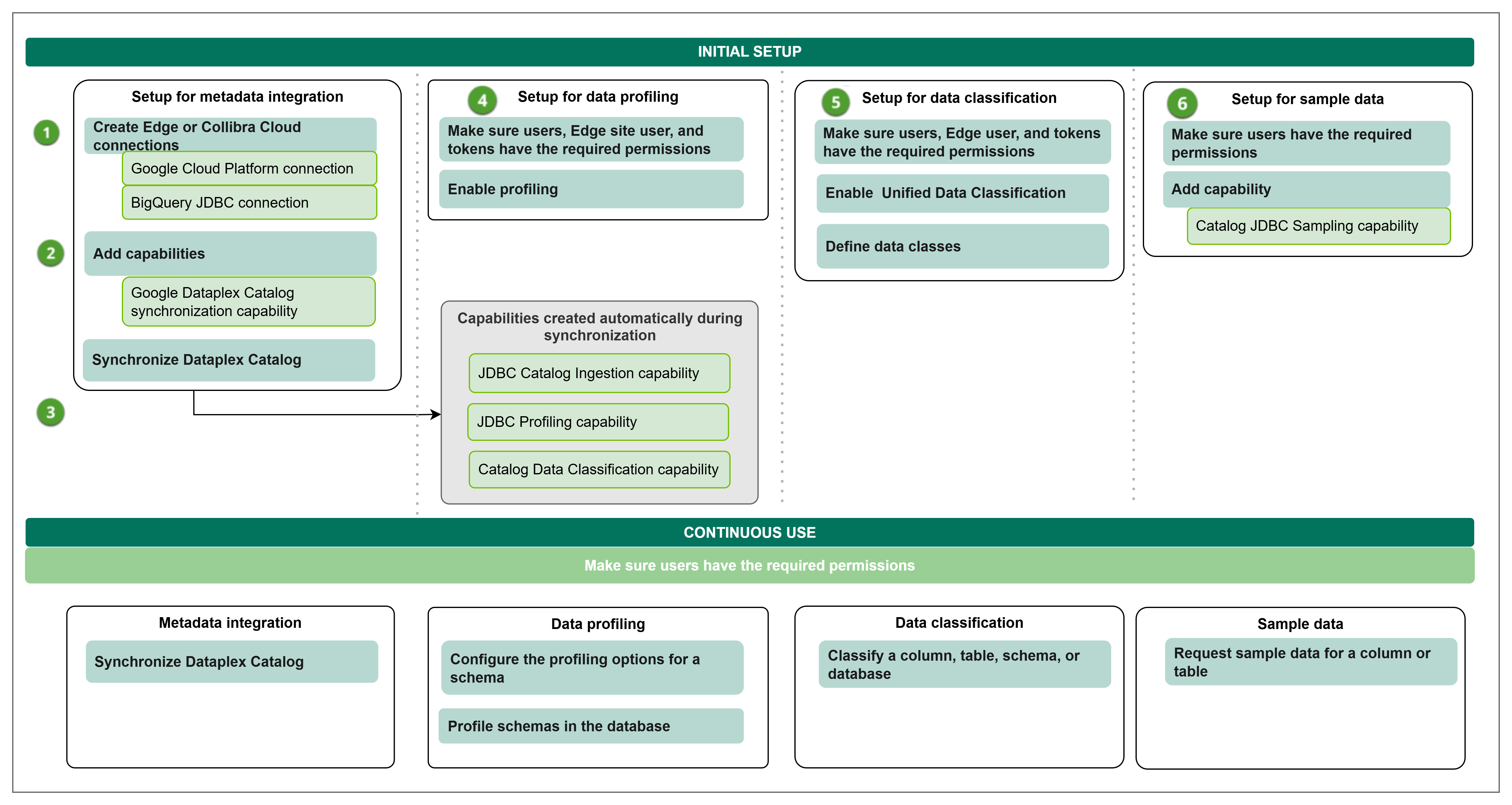 6 | Optionally, set up and configure the use of sample data | Goes through the required permissions and steps to prepare Edge and Collibra to show sample data for columns in Dataplex Catalog. |