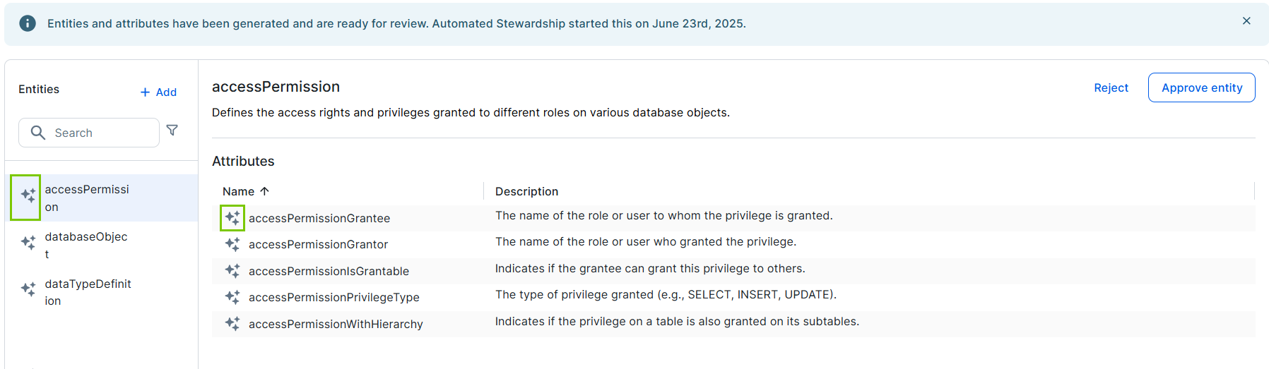 The suggested entity is saved as a Data Entity asset in the data model and the icon of the entity in the page changes. - For each suggested data attribute available in the Attributes pane for this Data Entity, validate the suggestion, and edit, approve, or reject it.