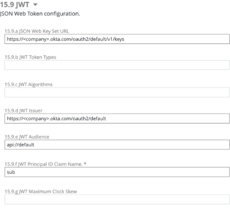 - Enter the values for JSON Web Key Set URL, JWT Issuer, JWT Audience, and JWT Principal ID Claim Name.