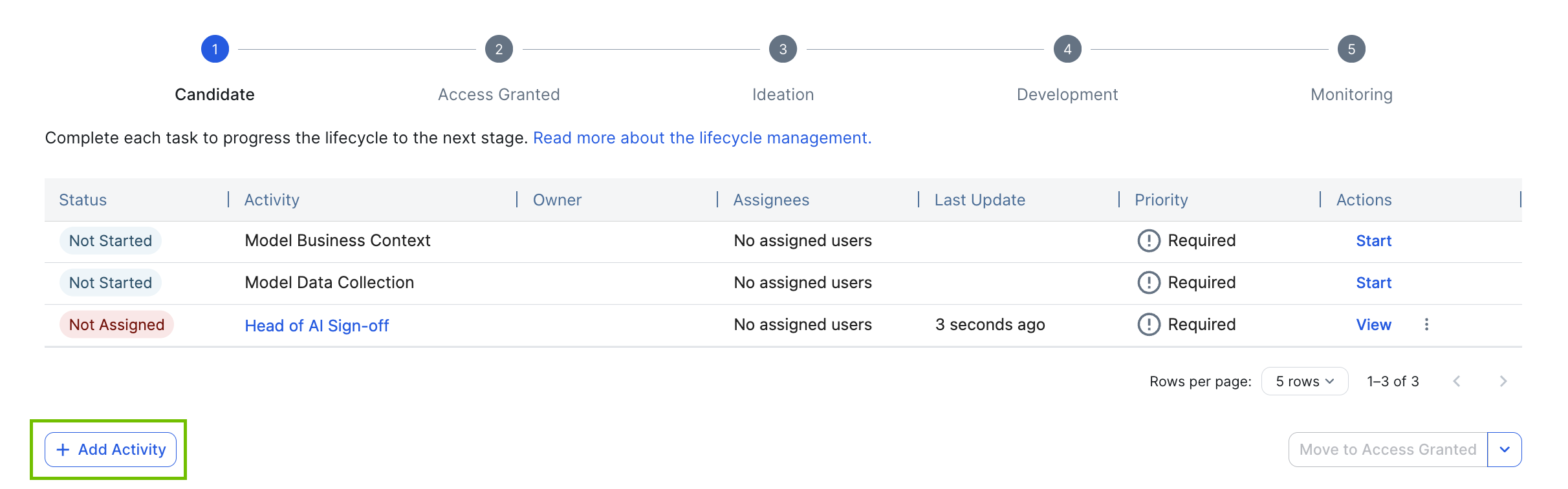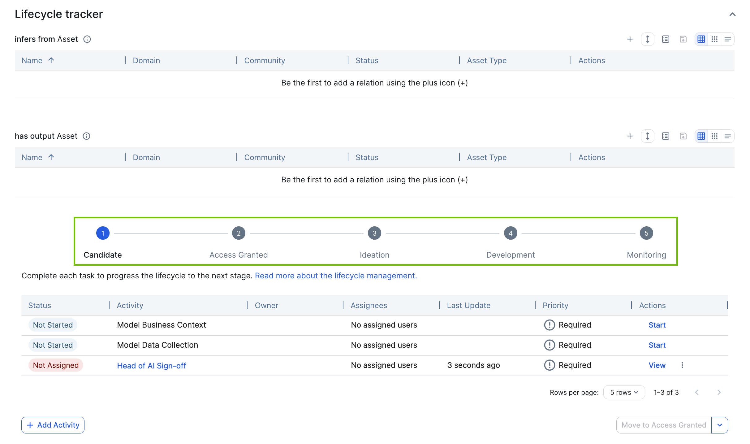 For guidance on how to configure lifecycle stages, go to Configure the lifecycle stages of AI Governance assets.