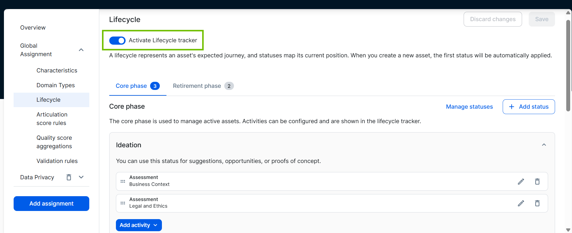 Tip If the feature is available for an asset type, the Activate Lifecycle tracker option is shown in the Lifecycle tab of the asset type's global assignment.