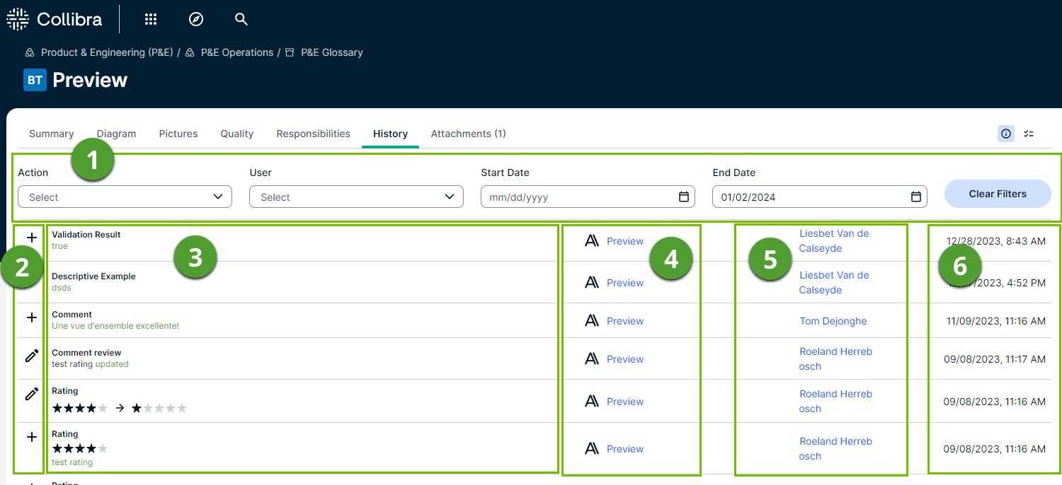 Collibra automatically keeps a history of users and resources such as assets, domains, and communities. This history keeps track of most changes to that resource and its children, as well as who made the changes.