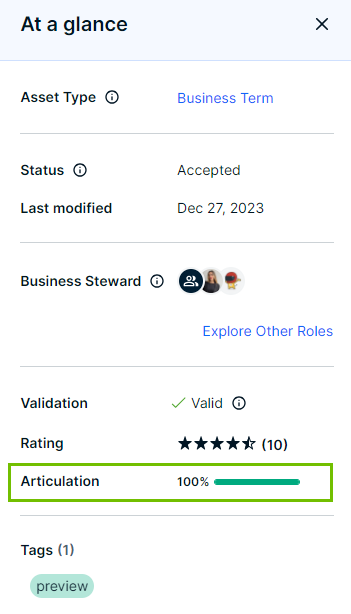 The articulation score of an asset is a percentage that indicates how complete the asset is according to the articulation score rules. It is typically used to give you a quick estimation of the status of the asset and whether the most important characteristics are present.