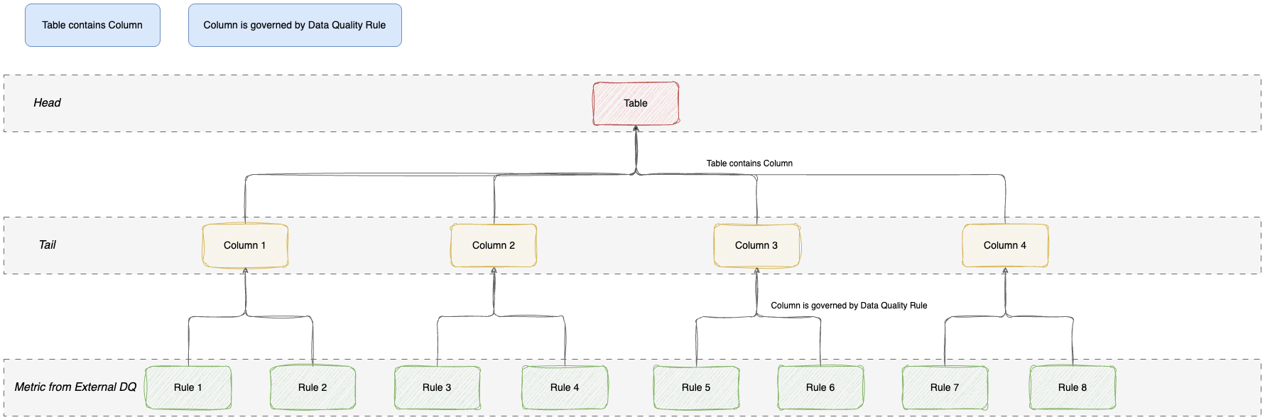 In the following example, the chain of relations in the aggregation path is Table contains Column and Column is governed by Data Quality Rule.
