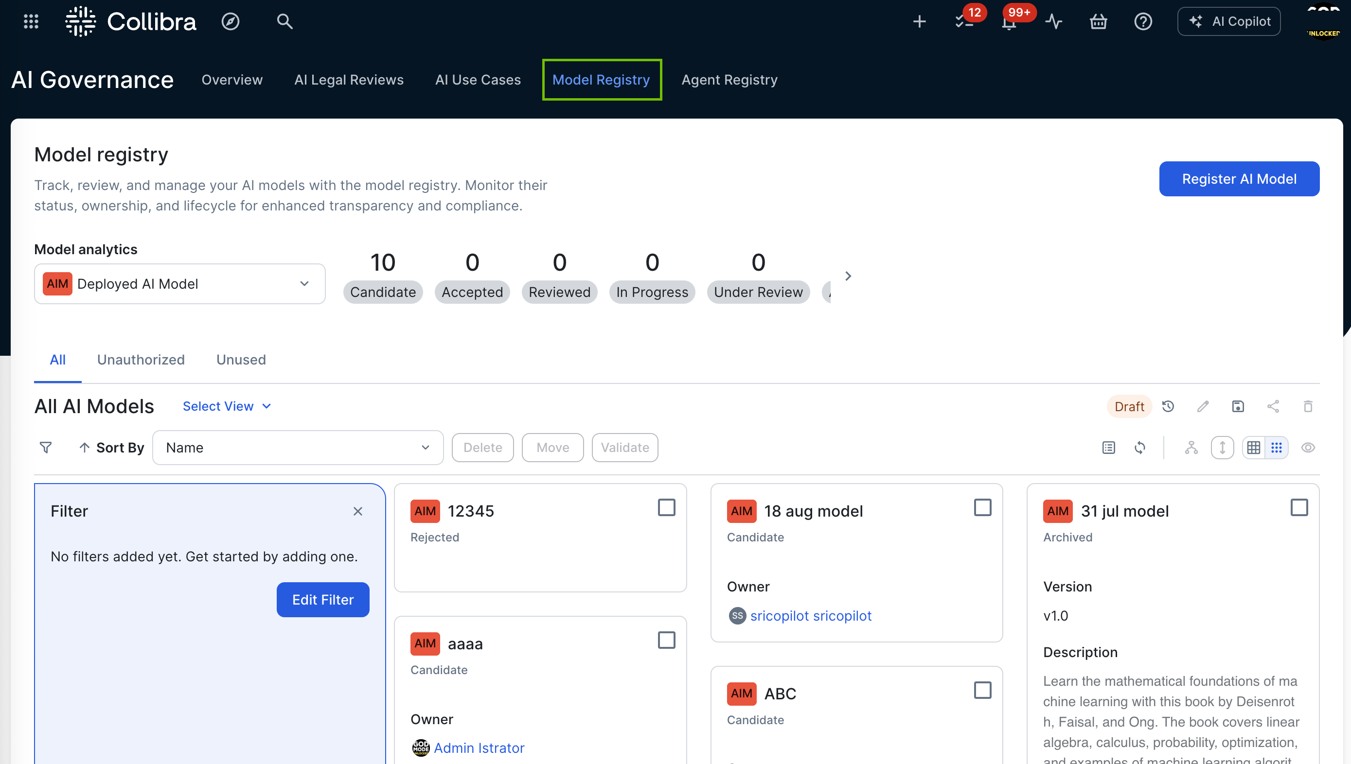 Collibra AI Governance allows you to create a centralized repository for AI agents, AI models, and AI use cases, offering a holistic end-to-end view of all your organization's AI projects. It is designed to minimize the burden of model developers and governance professionals alike.