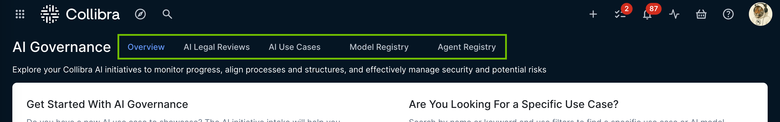 When you open AI Governance, the Overview page opens. Across the top of the page are links to other AI Governance product pages, including the AI use case, AI model, and AI Agent registries.