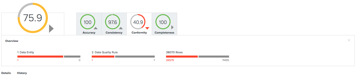 In the following example, the Conformity dimension consists of a total of 38070 rows, 26575 of which were failing. 2 data quality rules were involved, 1 of which was failing. These data quality rules were used by 1 data entity, which has an aggregated failing result.