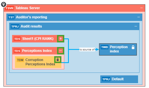 Boxed and boxing: Many relation types are used to describe a part-whole relation, such as "Tableau Project groups / is grouped by Report". For that reason, you can also represent the relation between those assets as boxing nodes and boxed nodes.