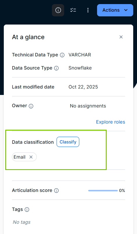 | Connect a data class with a Data Category asset from the Data Classification page or the Data Category asset page. |