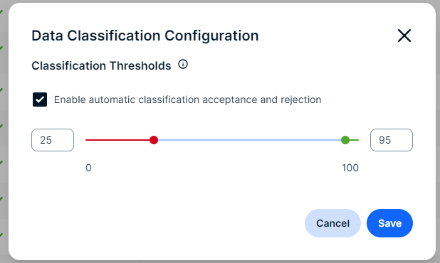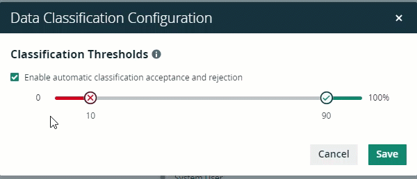 The bar automatically updates.ExampleIn this example, we set the rejection value to 25 and the acceptance value to 95. This means that all data classification suggestions with a confidence level of 25% or lower will be rejected automatically. Data classification suggestions with a confidence level of 95% or higher will be accepted automatically.