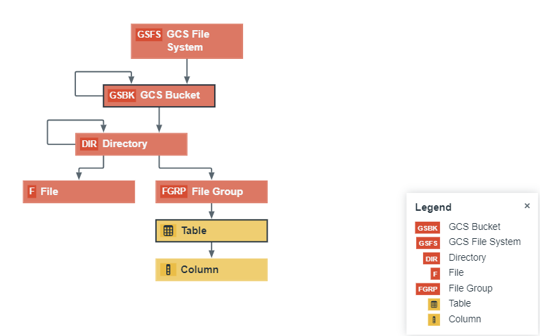 The Google Cloud Storage (GCS) file system integration uses a specific subset of asset types. These are available out of the box. For more information on asset attributes or metadata synchronized per asset type, go to Integrated Google Cloud Storage data.
